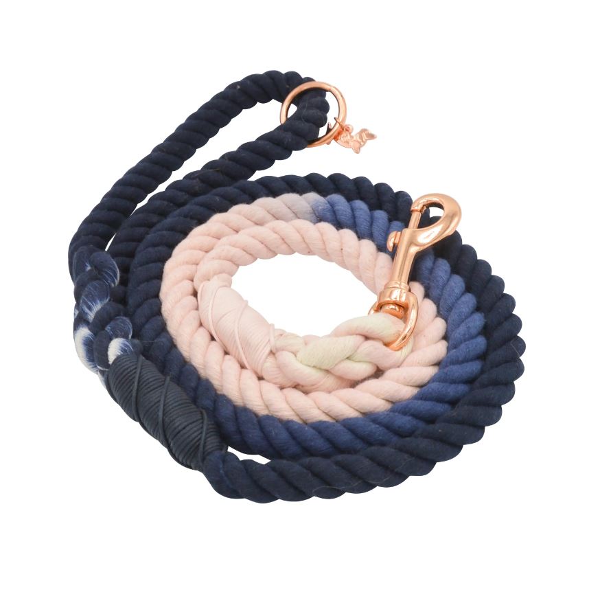 Beautiful colored rope will be sure to add a pop of color to any dog’s wardrobe! Made with strong, 100% cotton rope and natural dye. The rope is hand-spliced and ends are whipped to add strength and durability. Finished with beautiful rose gold hardware with a rose gold dog charm and accessory ring.